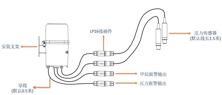 ③甲烷报警输出 2芯 1+/2- 压力报警24V高电平输出(≤100mA);